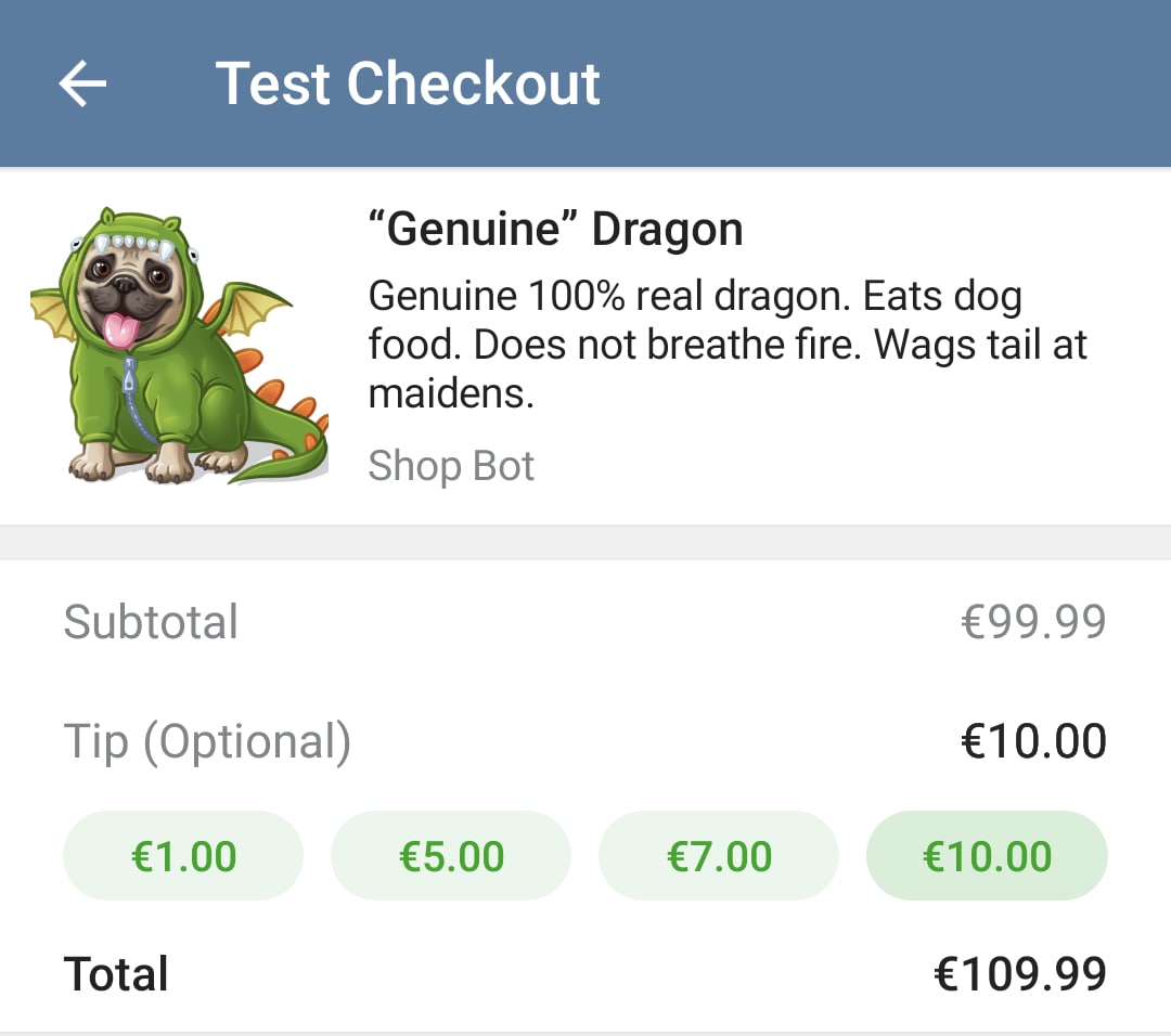 Invoice messages feature a photo and description of the product along with a prominent Pay button. Tapping this button opens a special payment interface in the Telegram app. In this interface, users can choose a tip amount (if allowed by the merchant) and enter additional details like shipping info, phone number, or email address.