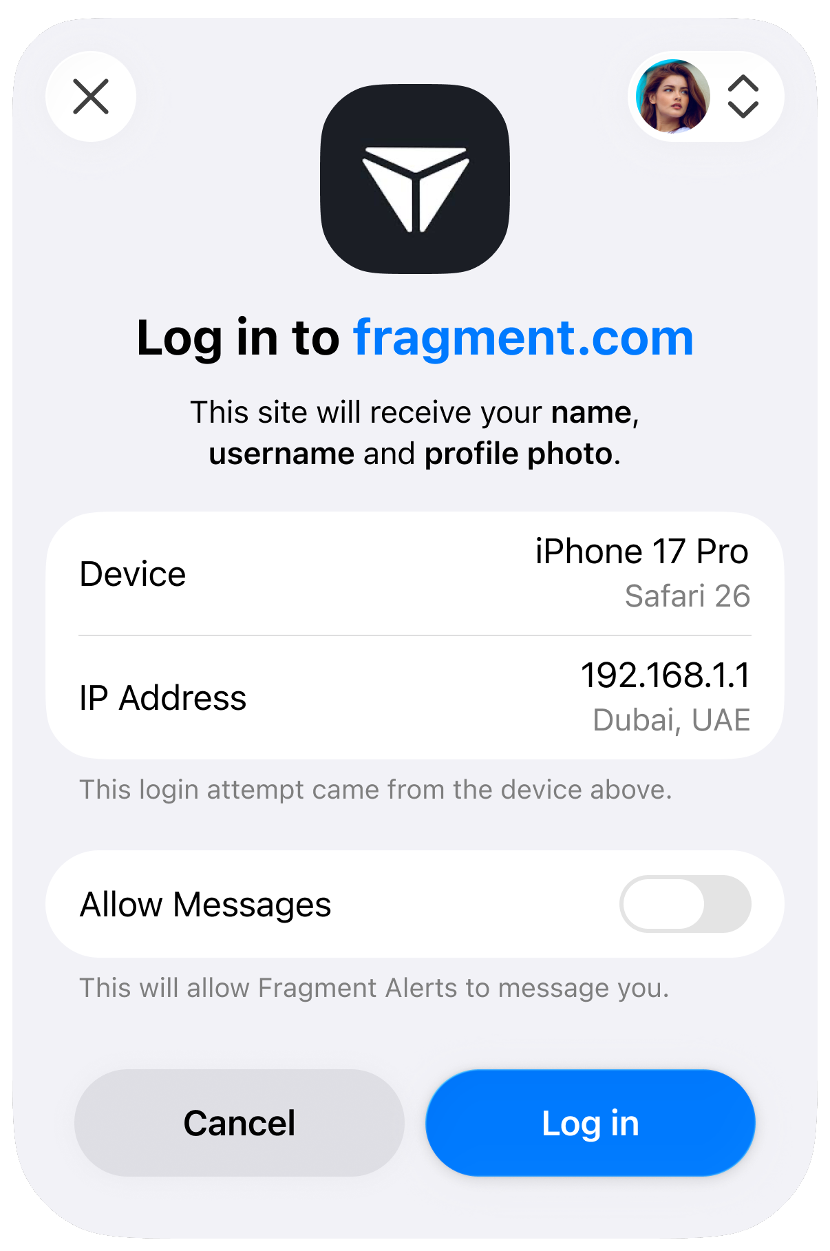 We strongly recommend that the profile picture of the bot corresponds with your website's logo, and that the bot's name reflects that connection. Users will see a confirmation box similar to the one below when logging in: