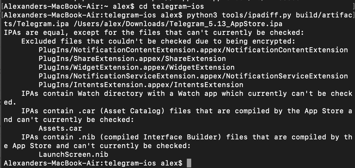 Runpython3 tools/ipadiff.py build/artifacts/Telegram.ipa PATH-TO-THE-IPA-FILE-FROM-STEP-9